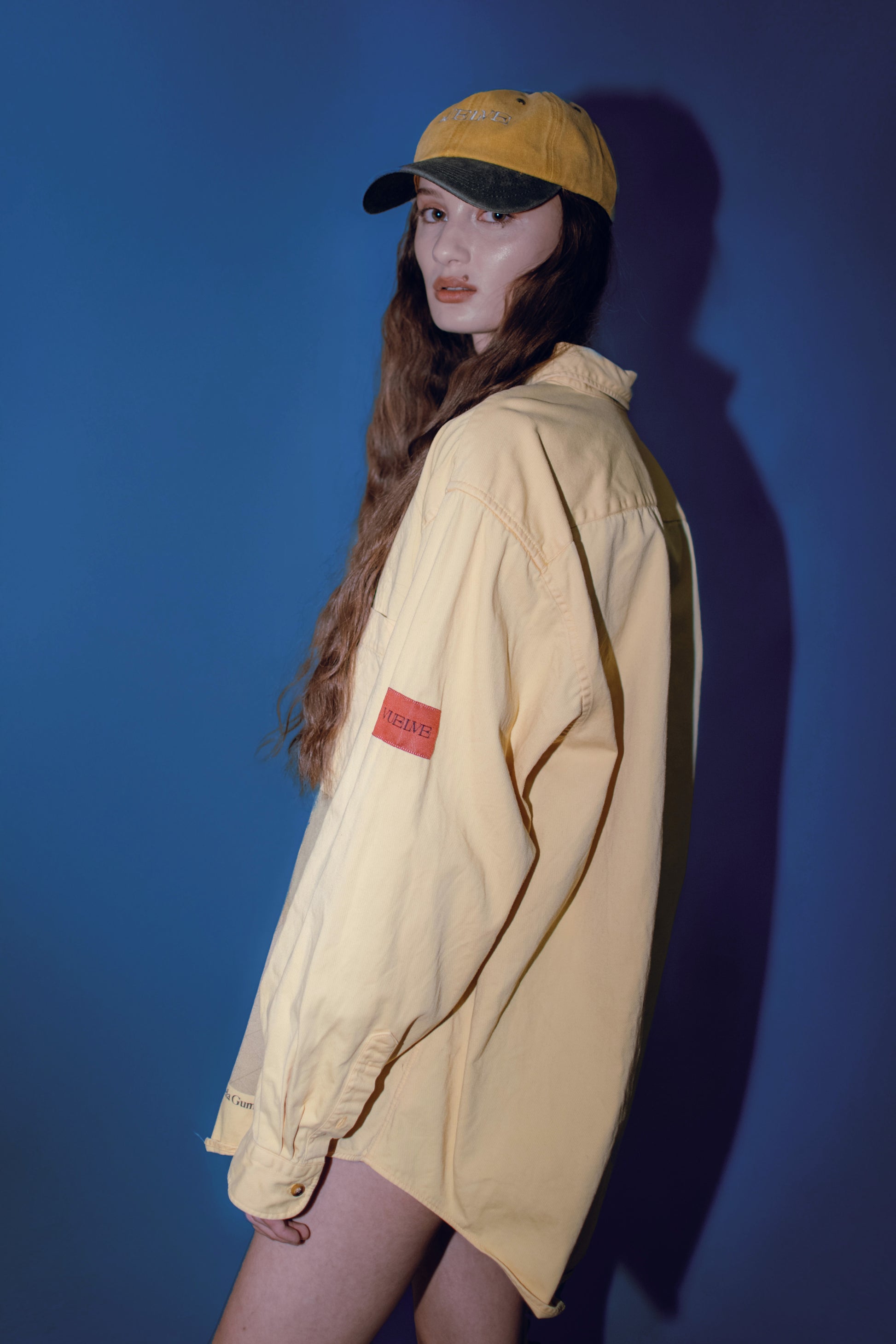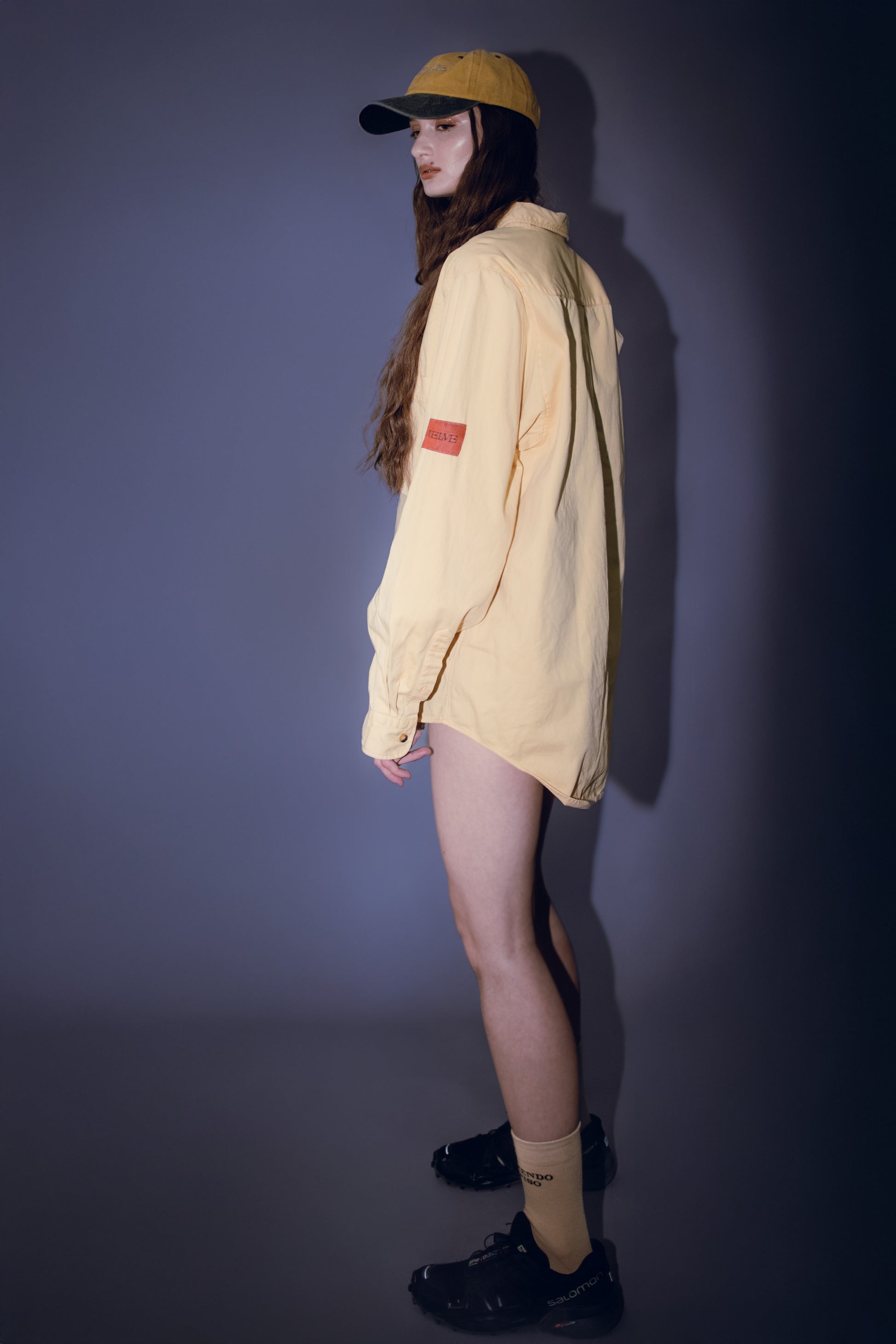Camisa unisex amarilla de mezclilla con fotografía titulada Selfcare